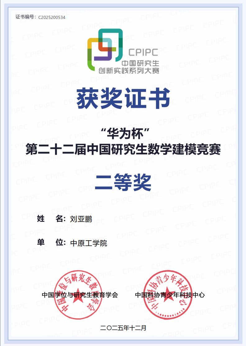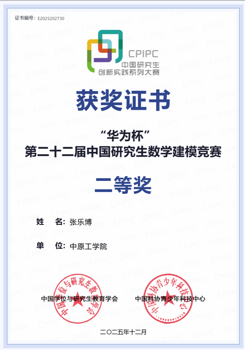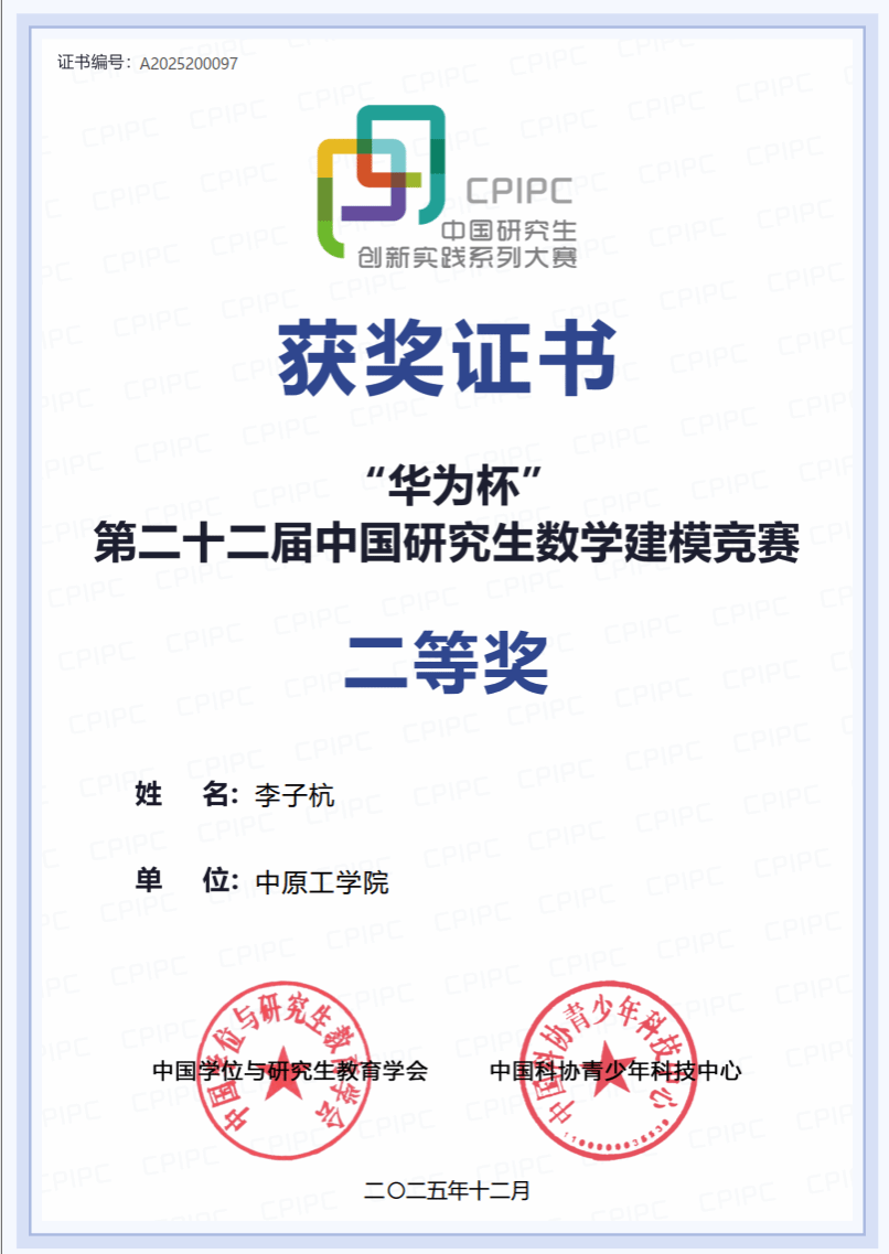 我院在2025年“华为杯”第二十二届中国研究生数学建模竞赛再创佳绩,共获国家级奖项9项,包括国家二等奖4项、三等奖5项,展现出我院研究生扎实的专业素养与创新能力。