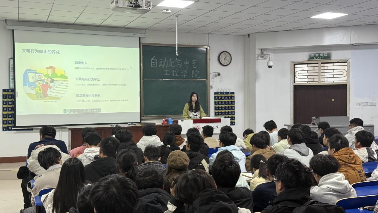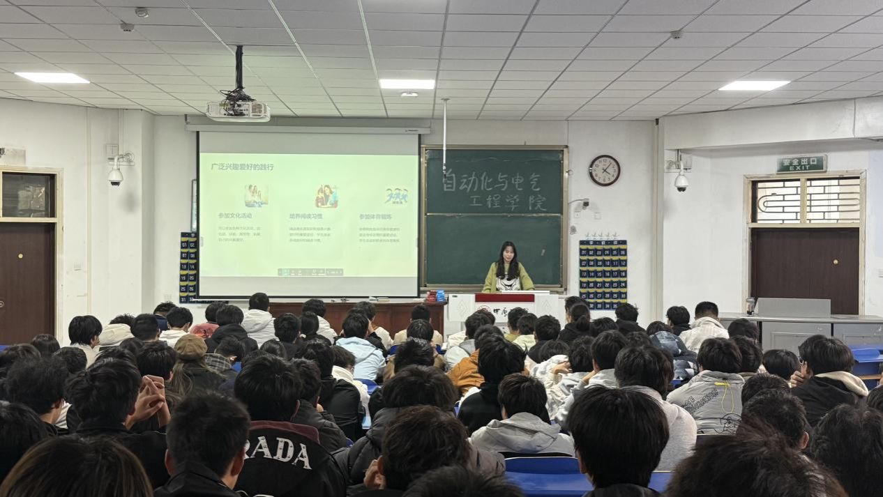 为引导2025级新生尽快适应大学学习生活节奏,树立积极健康的心理发展观念,涵养文明得体的行为习惯,2025年11月21日,自动化与电气工程学院面向25级新生成功举办了“启航·心成长”心理健康主题年级大会。本次大会围绕行为规范、礼仪修养、兴趣培养等多个与心理健康息息相关的维度展开,旨在帮助新生从入学伊始便建立起全面、积极的自我认知与成长框架,为未来四年的专业学习与个人发展奠定坚实的心理基础。